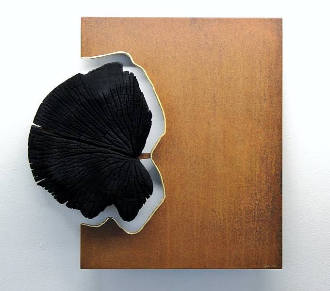 grösse. 60 x 45 cm / eichenholz, gebrannt / metall, gerostet / gold 24kt